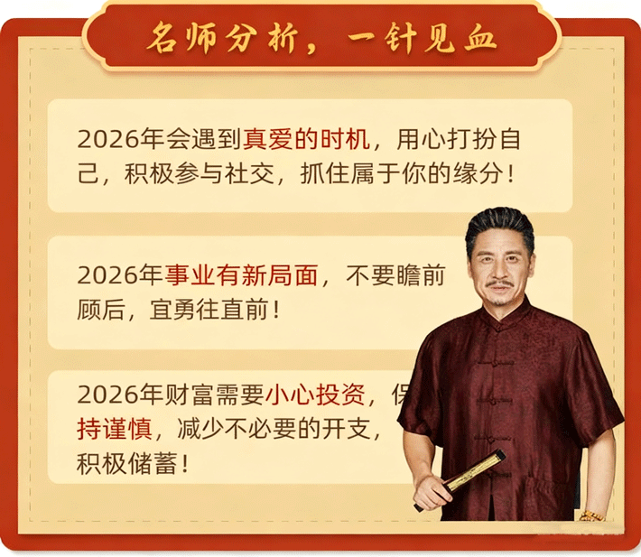 3、用户理解并接受本平台或2026马年运势测试风水起名/八字算命/财运姻缘/周易/运势测算/塔罗牌占卜提供的服务中可能包括广告,同意在使用网络服务的过程中显示本平台或2026马年运势测试风水起名/八字算命/财运姻缘/周易/运势测算/塔罗牌占卜和第三方供应商、合作伙伴提供的广告。