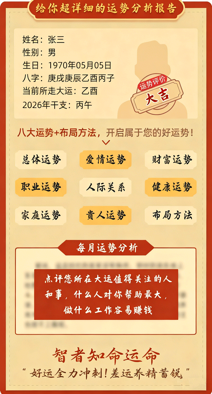 4、为了便于用户使用本平台或2026马年运势测试风水起名/八字算命/财运姻缘/周易/运势测算/塔罗牌占卜相关服务,用户理解并接受,本平台或2026马年运势测试风水起名/八字算命/财运姻缘/周易/运势测算/塔罗牌占卜可以通过邮件、短信、电话、站内信、弹出消息、客户端推送等形式,向本平台或2026马年运势测试风水起名/八字算命/财运姻缘/周易/运势测算/塔罗牌占卜网络服务的注册用户、购物用户、收货人等发送公示文案、订单信息、促销活动、广告等各类通知。
